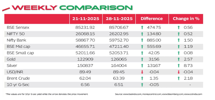 Brent Crude: $63.05 per barrel. Rupee ended the week at ?89.41 against the US dollar. 10-Year Benchmark Yield: 6.52%. Gold prices closed at Rs 1,26,220 per 10 grams.